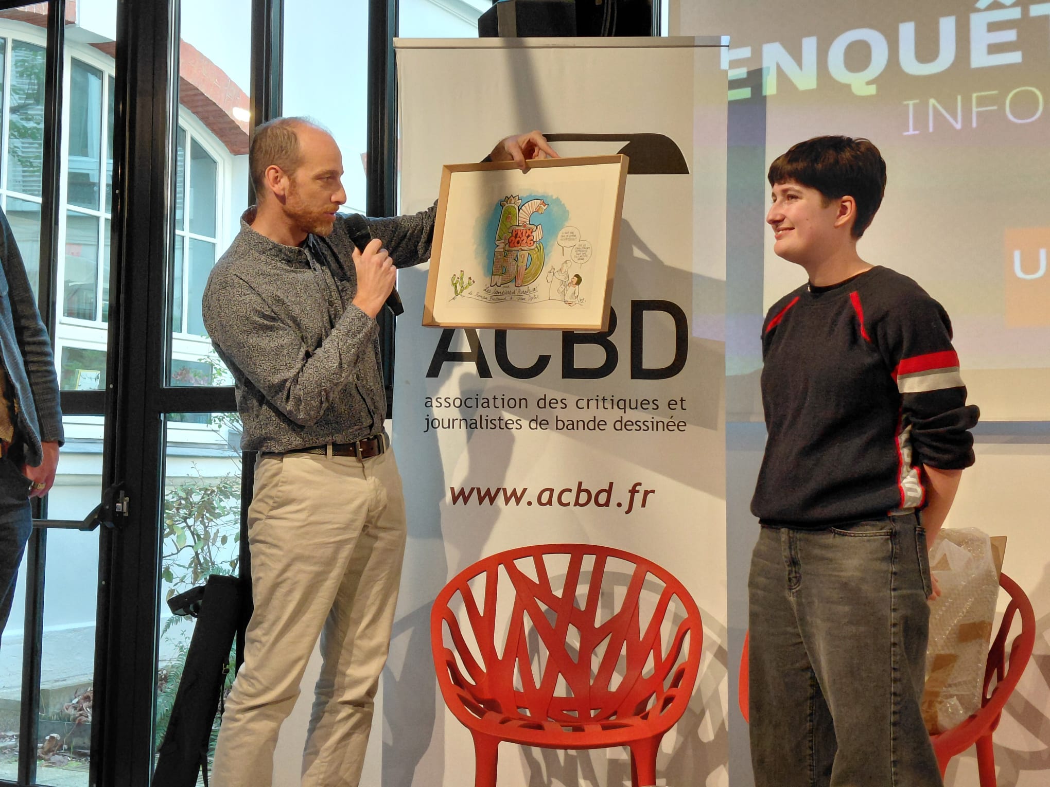 Jean Dytar a reçu un trophée spécialement conçu par le précédent lauréat, Luz (Deux filles nues), encadré par nos soins.